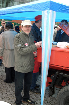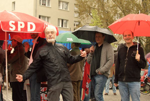 Der Hennigsdorfer Ortsvereinsvorsitzende Werner Hoffmann trotzt dem Regen...