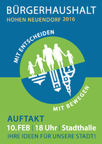 Auch in diesem Jahr haben die Bürger unserer Stadt die Möglichkeit, Projekte, die ihnen besonders wichtig sind, für den Bürgerhaushalt der Stadt Hohen Neuendorf vorzuschlagen. Die Sammlung von Vorschlägen läuft in diesem Jahr vom 10. Februar bis zum 9. März 2016. Am kommenden Mittwoch, 10.2., findet um 18.00 Uhr in der Stadthalle die Auftaktveranstaltung statt.